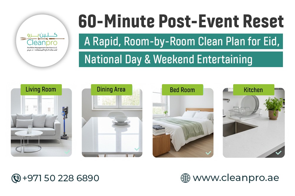 Hosting family and friends for Eid, National Day, or even a casual weekend get-together is always a joy. But when the last guest leaves, reality hits: cups on the table, crumbs on the sofa, and dishes stacked up in the sink. A full deep clean may not be possible immediately, but what you can do is a quick, effective reset to get your